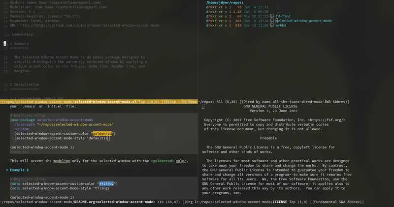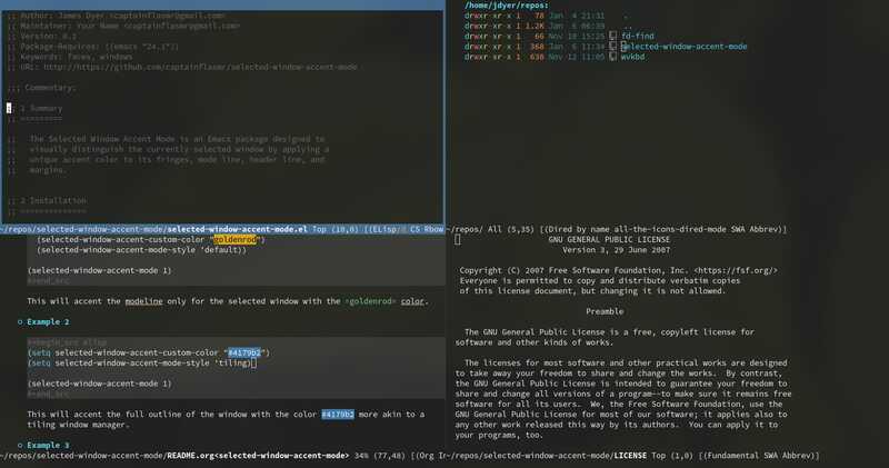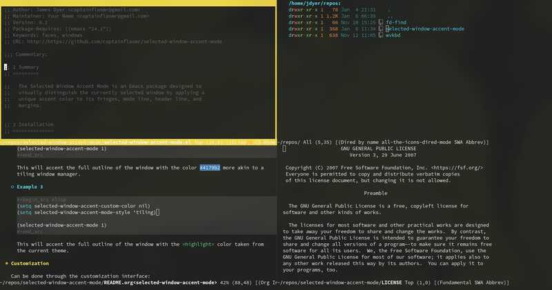 The Selected Window Accent Mode is an Emacs package designed to visually distinguish the currently selected window by applying a unique accent color to its fringes, mode line, header line, and margins.