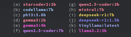 (c) funnyname:latest (f) llama:latest